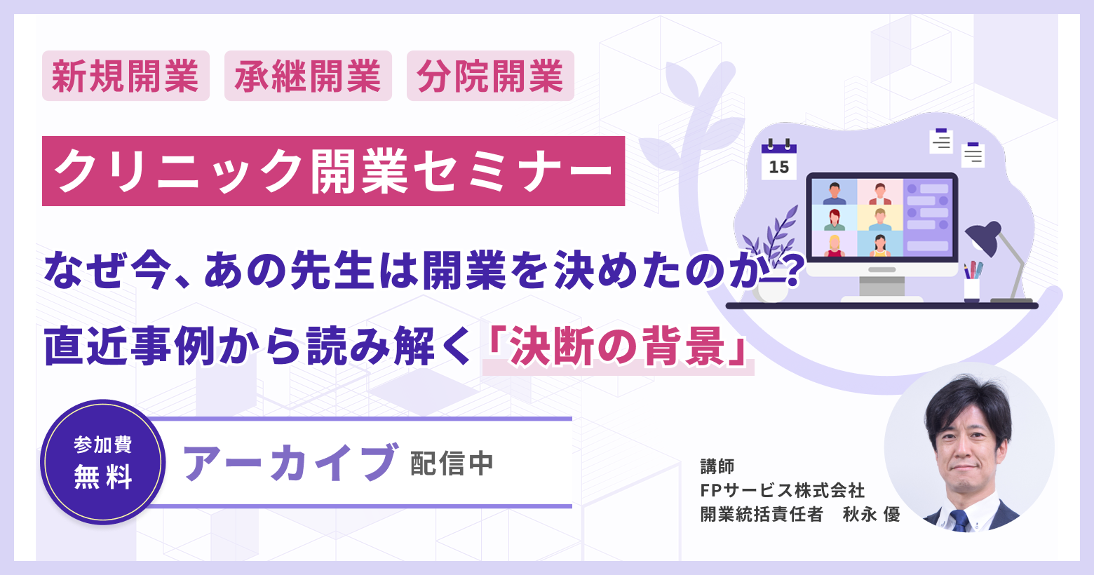 開業を目指したきっかけ 医局に所属する医師であれば多くの方が感じることかもしれませんが、意図しない人事異動が続くことに疲れ、落ち着きたいと考えるようになりました。 加えて、昨今の急性期病院の赤字状況を