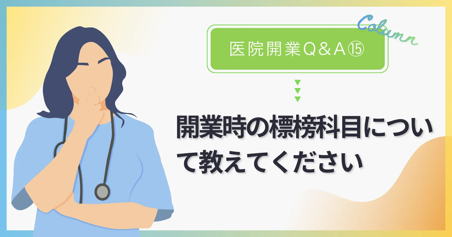 クリニックの開業をお考えの先生から、実際にご質問を頂戴した内容をQ&A形式でまとめました。下記の質問文をクリックしてQ&Aをご覧ください。