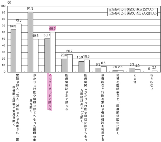 受診する医療機関を選ぶ際に、何を参考するのかという調査が東京都生活文化局広報広聴部広聴管理課によって行われました。その結果、平成16年の時点ですでに、かかりつけ医のいない人では「インターネットで調べる」が2位に挙げられています。